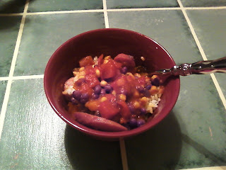 Slice the sausage and put in a large skillet for two minutes to brown slightly. Saute the peppers. Add the corn and beans and stir. Add the pasta sauce and diced tomatoes. Simmer for 5 minutes. Serve over rice.